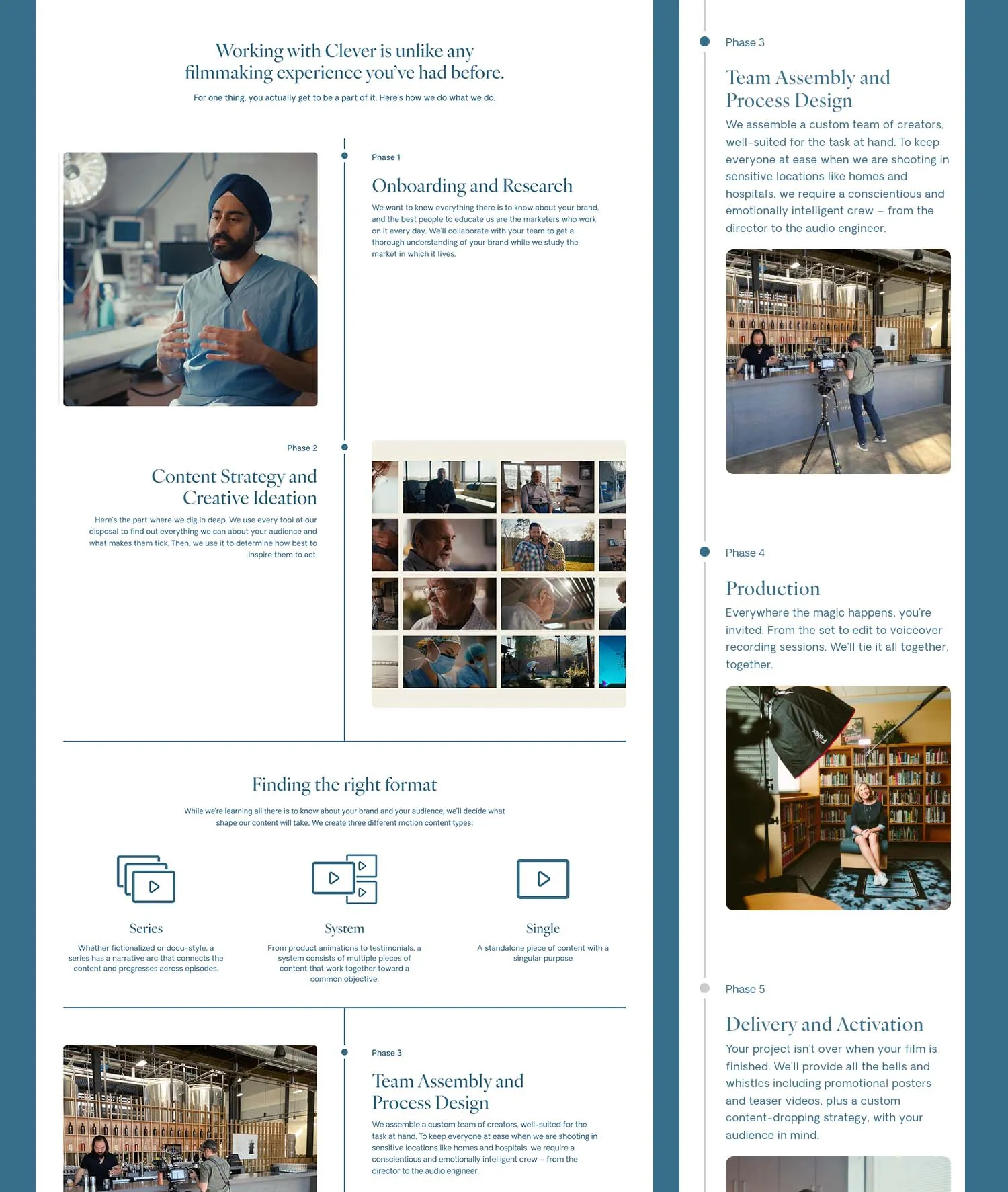 Clever is a strategic film production company focused on episodic docuseries content for brands. After 5 years in business, we collaborated to focus their efforts on what was working best for them and their clients. Clever has carved out a niche in creating a content strategy and filmmaking that complimented the brand work work that was across marketing and other efforts to tell stories in a very authentic and meaningful way. The outcome of this work was an updated brand identity, updated reel and motion graphics and a website that showcased their work and unique process.